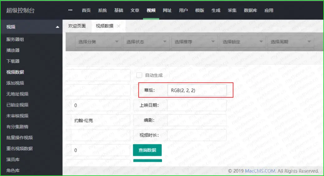 6,还是来到系统-后台>>视频>>视频数据>>编辑中找到我们需要推荐幻灯显示的影片,然后点击右边的编辑进入到基本信息选择“幕后”填写颜色值代码。RGB(2, 2, 2) 一定要遵循这个格式填写要不然不会生效,如果怕出错你可以复制我的代码只替换里面数字即可。