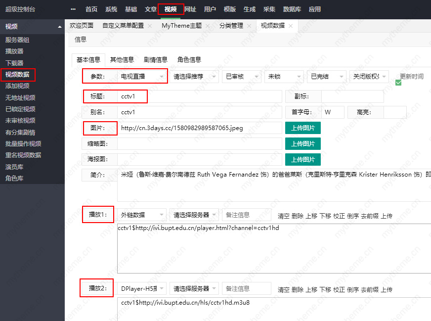 3,添加TV电视直播源链接步骤:后台视频>>视频数据>>添加>>【参数:选择我们刚添加的新分类“电视直播”】【标题:填写要添加的电视台名称】【图片:上传准备好的电视台台标】