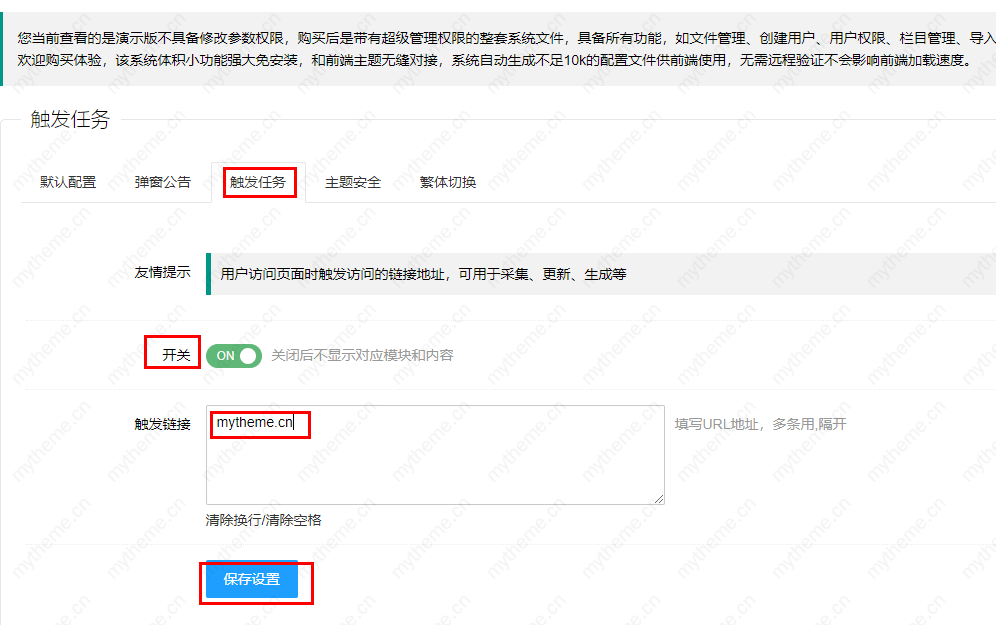 2,如果你使用的是我的主题网苹果cms模板不用去宝塔或是其他的监控平台添加定时任务,可以直接使用模板自动定时监控任务功能就可以搞定。只要有人访问你的网站就可以实现自动采集。一定是使用的是我的主题网最新的苹果cmsv10高端模板才有这个触发任务功能。