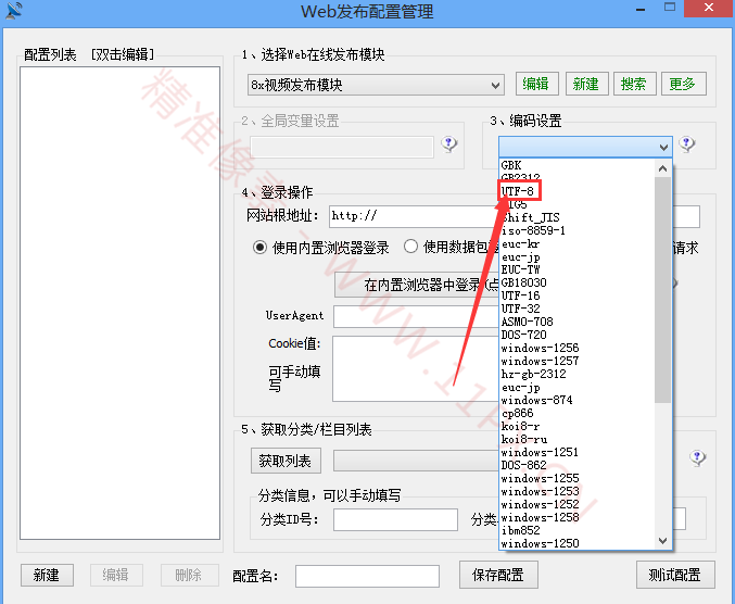 上面我们已经选择好了 “8X 视频发布模块”,现在我们来配置编码设置,点击小到三角选择“UTF-8”