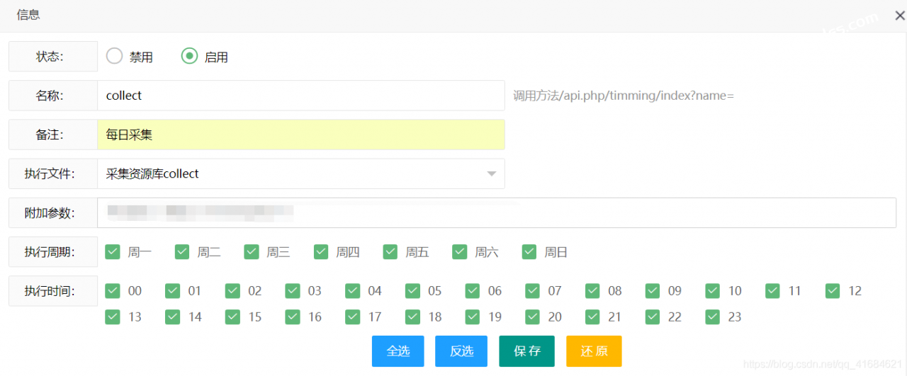 状态选为: 启用,名称和备注:可任写,附加参数:粘贴刚刚复制的链接,执行周期和执行时间的设置点击下面的全选按钮即可。