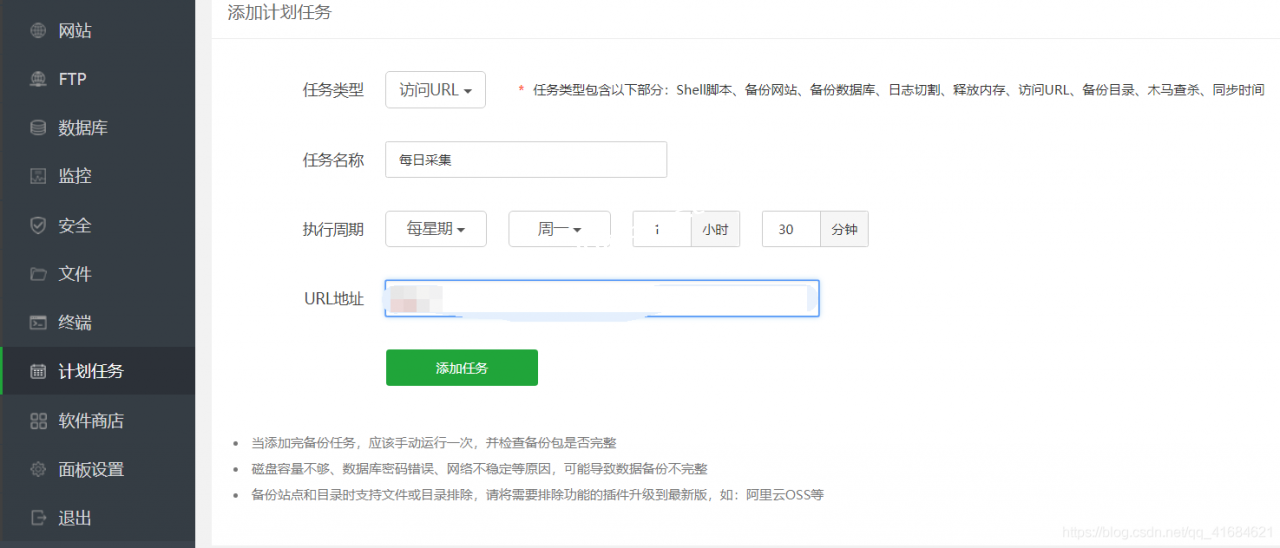 复制刚才的链接进入宝塔后台界面找到计划任务,按照图片所示添加任务,注意url地址填写刚复制的测试采集页面的地址,选择访问URL任务,按自己的需求填写执行周期参数后保存。