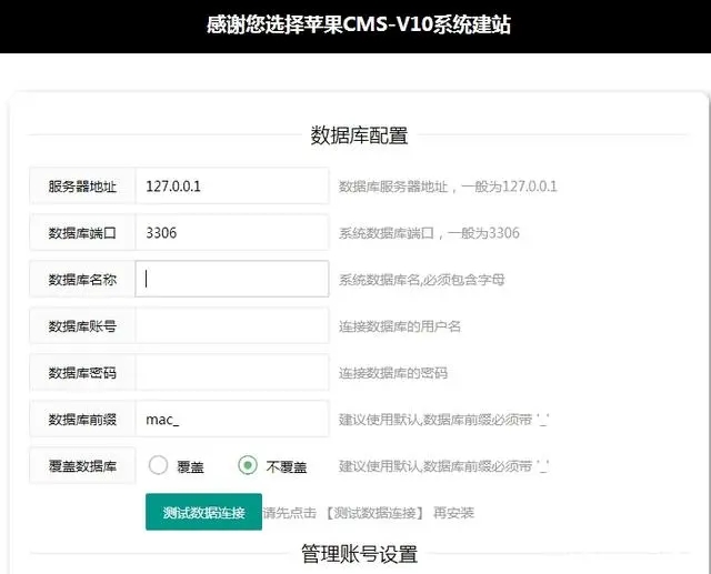 7、填写数据库配置,管理账号信息