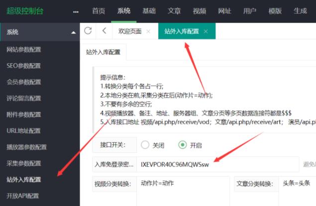 ①,先来配置验证密码:验证密码就是站外入库系连接苹果cms系统后台的验证码 ,这个需要去系统后台查看后填写,找到“验证密码”在右边的编辑框里复制粘贴到里面就可以了。