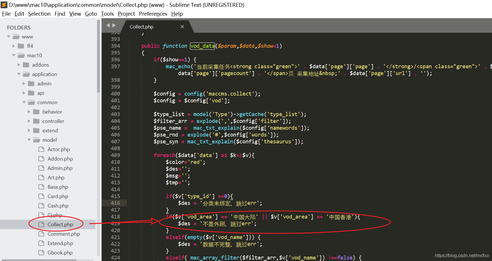 对于苹果CMS10想要根据地区采集视频,可使用如下方法修改cms进行过滤1.找到mac10如下代码位置,添加圈内的所示代码 代码:if($v['vod_area'] == '中国大陆