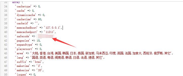 第二步是安全码,安全码数据库里面直接替换貌似没啥用,还好有一个文件可以直接看到安全码,我们打开网站的“\inc\config\config.php”文件,搜索找到“safecode”后面对应的就是后台登录的安全码了。