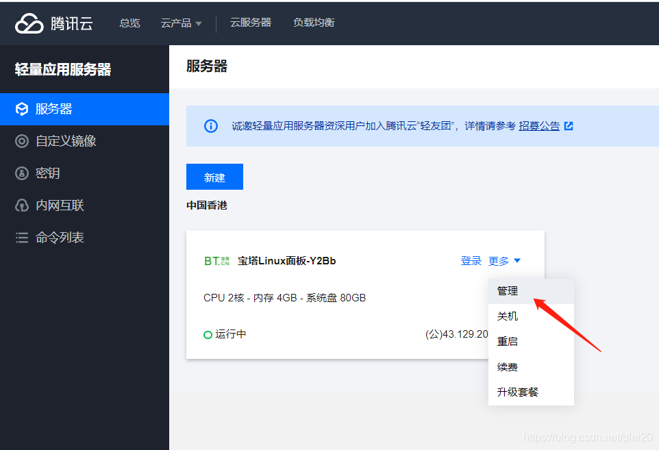 二、登陆服务器1.登陆腾讯云-控制台-轻量应用服务器-管理,找不到的话可以在控制台搜一下【轻量应用服务器】