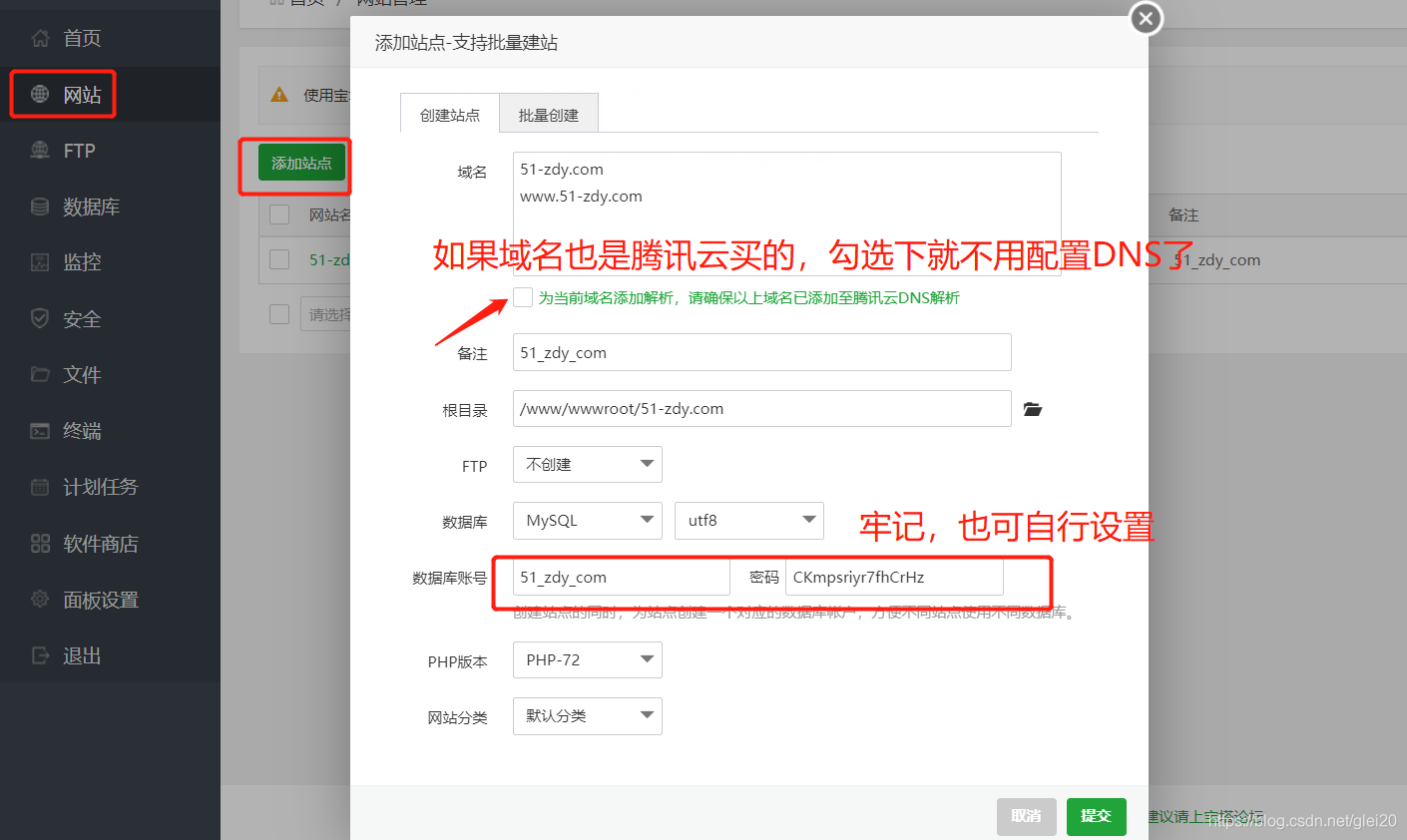 1.【网站】-【添加站点】-参考下面图片进行配置,非腾讯云的域名到域名控制台添加解析就行
