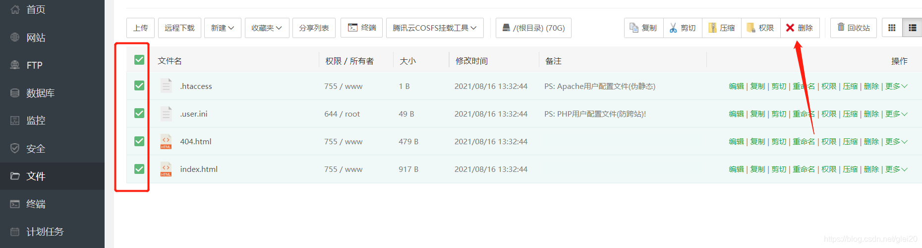 【全选网站中的文件-删除】,这些东西没用,删不了的不用管