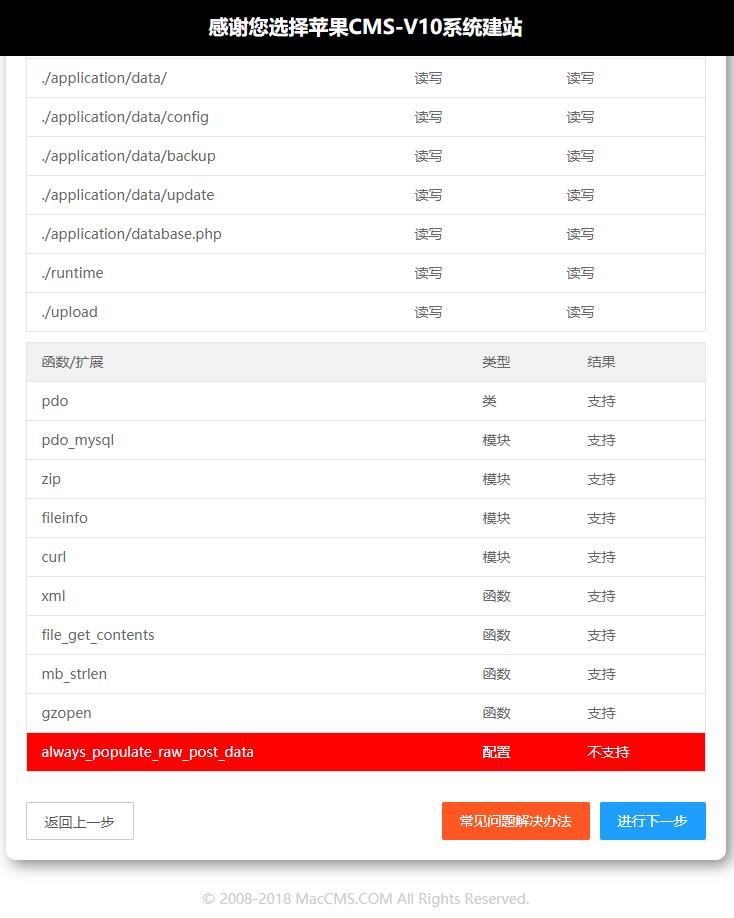 3,大家看到了,我安装时提示了一个环境配置的不支持错误,很好解决,找php配置文件“php.ini”并打开,接着搜索always_populate_raw_post_data 这串字符,之后把它前面的英文分号“;”去掉,并重启php服务和刷新本网页即可!最后,继续点击下一步到下个页面。