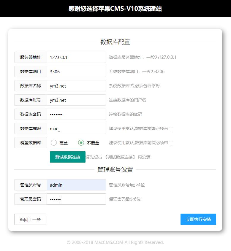 4,填写数据库配置以及设置好管理员账号,先点击“测试数据连接”按钮,如果连接正常则点击“立即执行安装”按钮,否则请仔细检查并找到地错误信息,改正后,测试->安装即可。