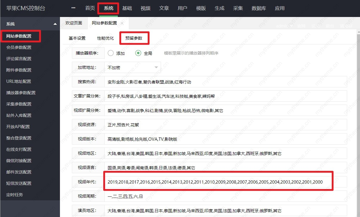 第一步:苹果CMS V10管理后台>>系统>>>网站参数设置>>>预留参数>>>视频年代>>> “2019,”逗号隔开(就是在2018,前面加上【2019,2020】保存即可。)