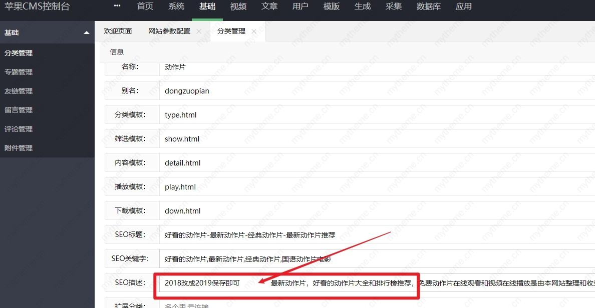 第三步:苹果CMS V10管理后台>>基础>>>分类管理>>>将【1:电影。2:电视剧。】以下的子分类,>>>SEO描述:2018改为2020保存即可。(只要看见SEO三个选项中有2018字样的,改为2020就可以了,)