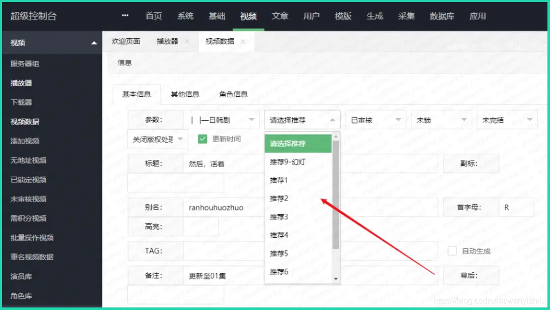 首先来到系统-后台>>视频>>视频数据>>编辑中找一部需要推荐显示的影片,然后点击右边的编辑