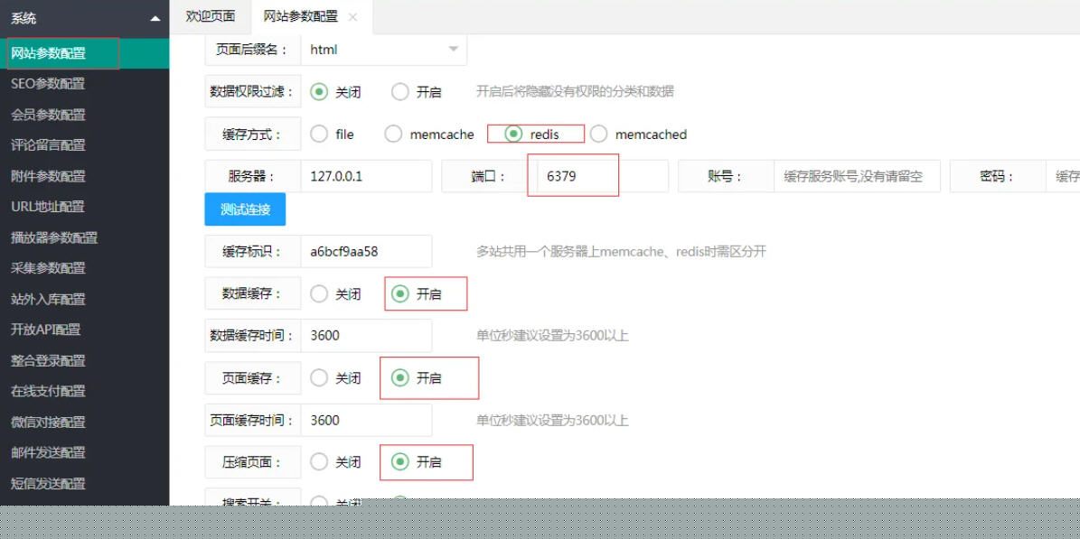 4,进入苹果CMS后台,网站参数设置-性能优化,缓存方式设置为Redis,IP:127.0.0.1端口:6379然后测试连接 连接成功代表能正常使用该缓存,然后开启:数据缓存/页面缓存(如下图)