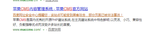 目前maccms官方被百度网址安全中心提醒您:该站点可能受到黑客攻击,部分页面已被非法篡改! 苹果官方网站因为特殊原因已经停止访问,该内容被禁止访问,但是升级补丁更新的网址还是可以打开的。