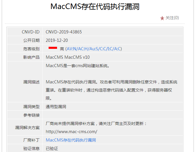 苹果CMS V8 V10版本存在代码重装漏洞,以及代码后门漏洞,任意文件删除漏洞,通过CNVD-2019-43865的信息安全漏洞通报,可以确认maccms V10存在漏洞,可以伪造恶意代码发送到网站后端进行执行,可以删除网站目录下的任意文件,可删除重装苹果CMS系统的配置文件,导致可以重新安装maccms系统,并在安装过程中插入sql注入代码到数据库中去执行并获取webshell以及服务器权限。