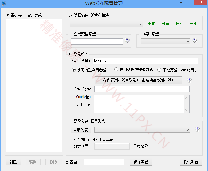 我们选择好了之后下面分类信心,自动填写,不用管、给配置输入个名字,我就用“测试”了、都输入好了,点“保存配置”、软件会自动弹出保存成功、在旁边的“配置列表”就能看得到我们刚保存的配置、然后点右上角的“X”关闭这个页面、到此为止“Web 发布配置管理”我们就弄好了,接下来就是采集发布了。