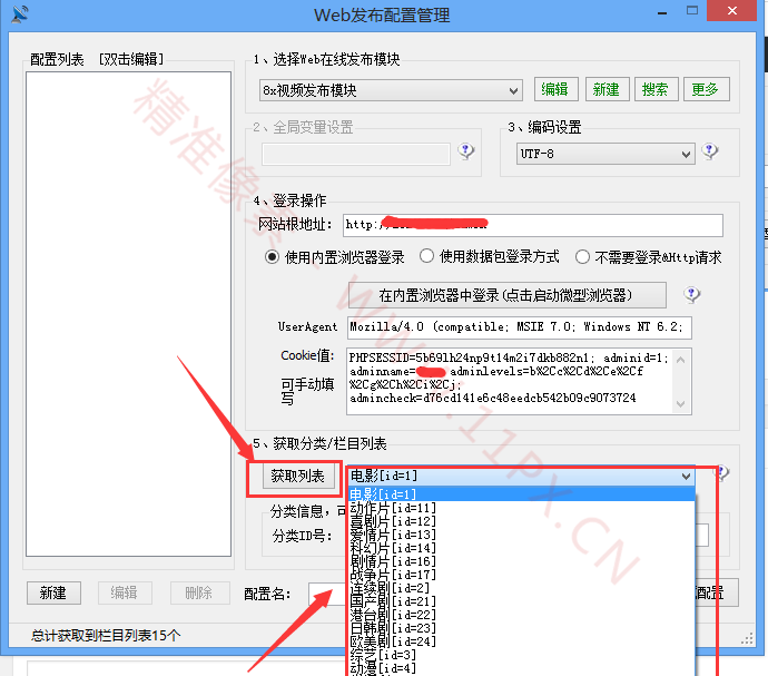 点击确定之后软件自动跳回(web 发布配置管理)、跳转回来之后 cookie 一栏自动出现上一步的获取的(用户名,密码,安全码)、如果没什么问题也不用手动填写。下面我们点击(获取列表)