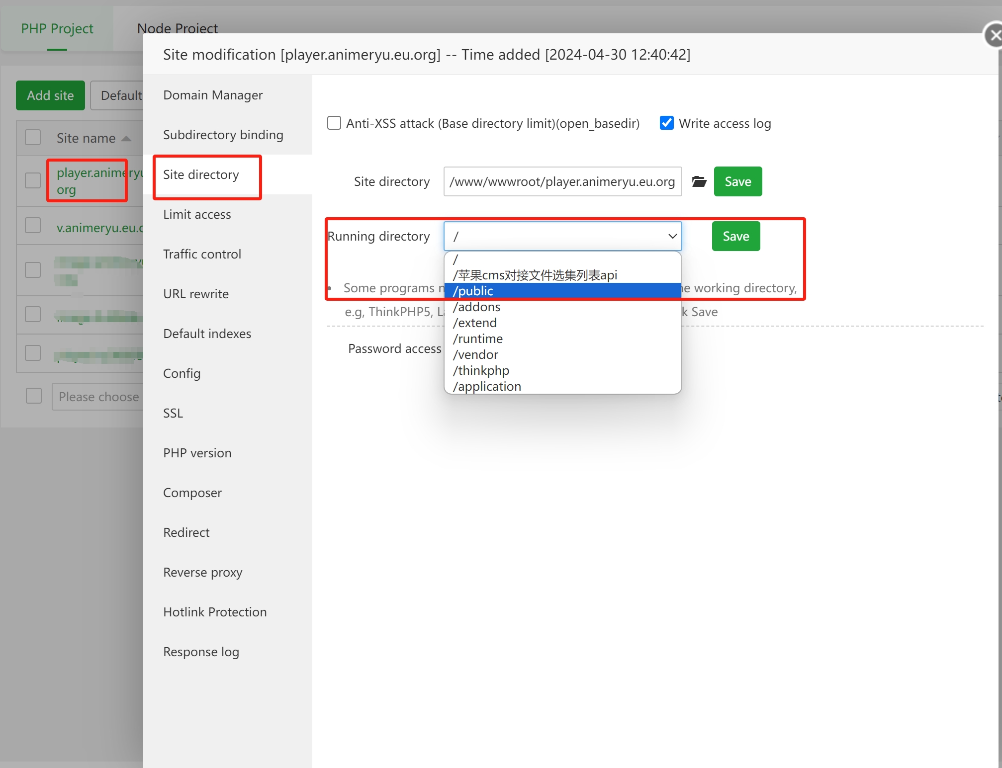 超级播放器通过aaPanel进入网站设置页面,选择URL rewrite——maccms保存即可。