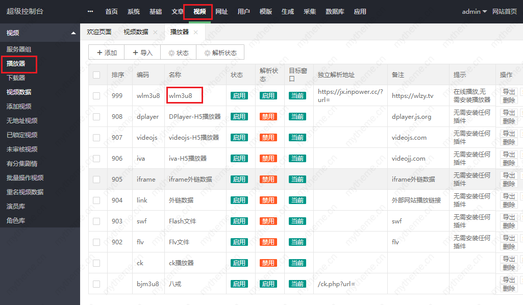 4.(视频>>播放器 )寻找下我们是否成功添加了wlm3u8编码的播放器。如果我们添加了播放器还是不能播放,首先清理下缓存最好是换个浏览器再来测试下。