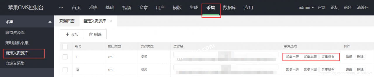 进入苹果cms10后台,点击–采集
