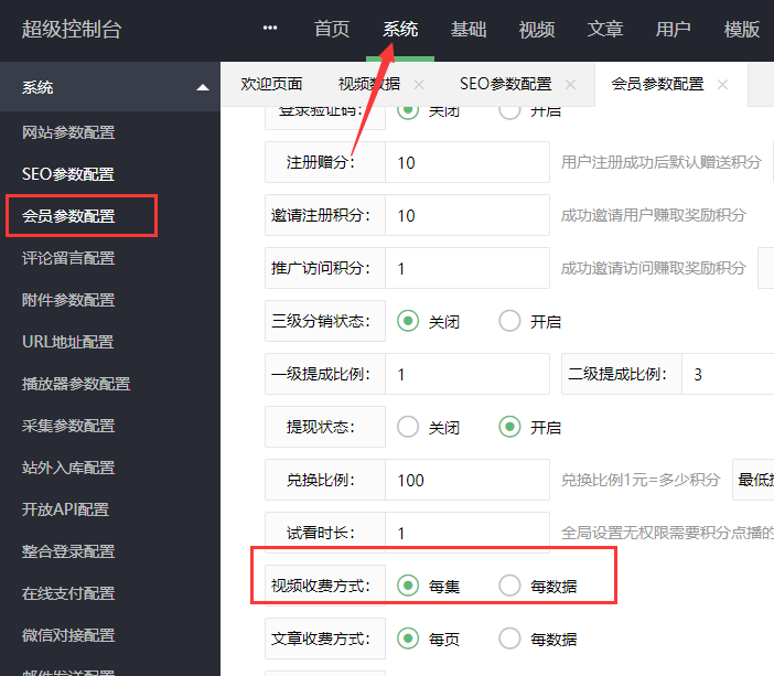 其中,整数据积分,就是说这个数据要多少积分才能看,点播积分就是说,点播一集需要多少积分,下载积分,就是说下载一集需要多少积分,具体如何收费,请在会员参数配置中设置