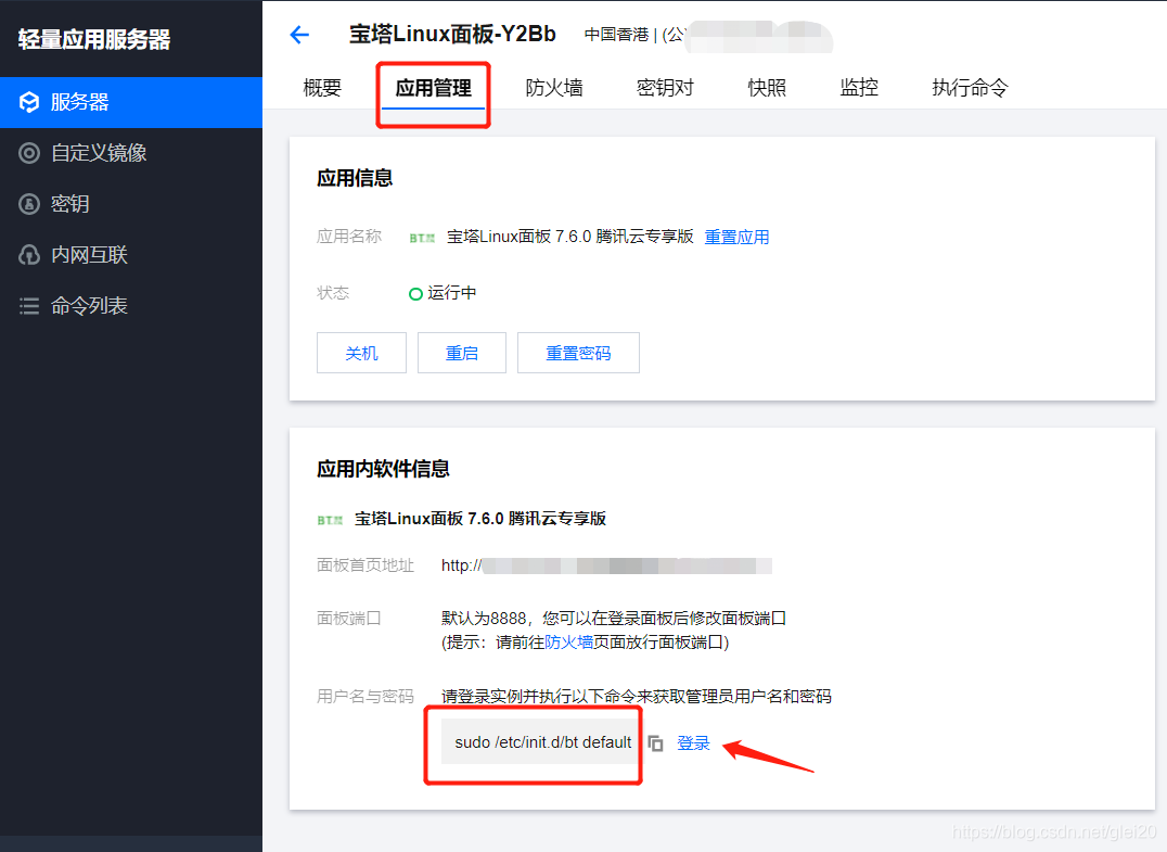 3.查看并记住宝塔的登陆地址、登陆账号、密码,步骤:【应用管理】-复制用户名与密码下方的命令,然后选择登陆;
