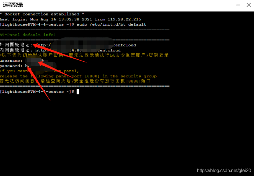 在弹出的对话中右击鼠标选择粘贴,然后回车就出现了上面说的地址等信息,复制这些信息,然后打开浏览器输入地址,用户名,密码就能进入宝塔面板了。