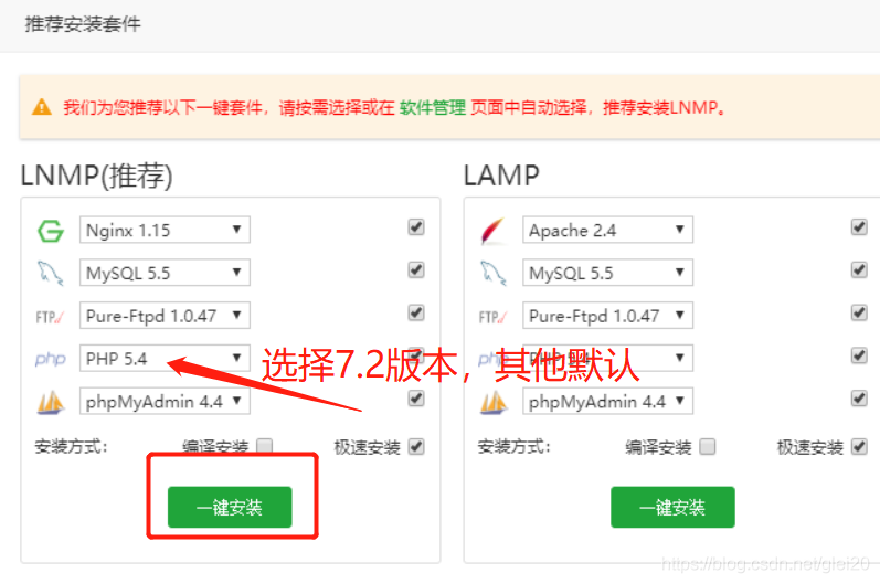 因为我宝塔已经安装配置过了就不卸载了重新安装演示了,你们登陆宝塔面板之后会弹出一个这样的对话框,按照图片操作就行,如果没有的话在软件商店找到这些安装也行。