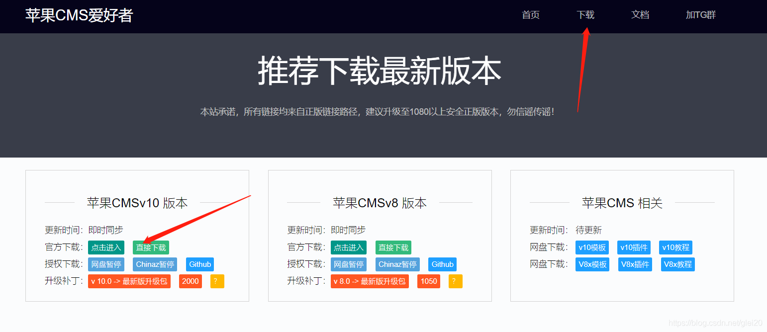 安装好后到苹果cms官网去下载源码:官网地址:https://www.maccms.cn/ 这里以v10版本为例;