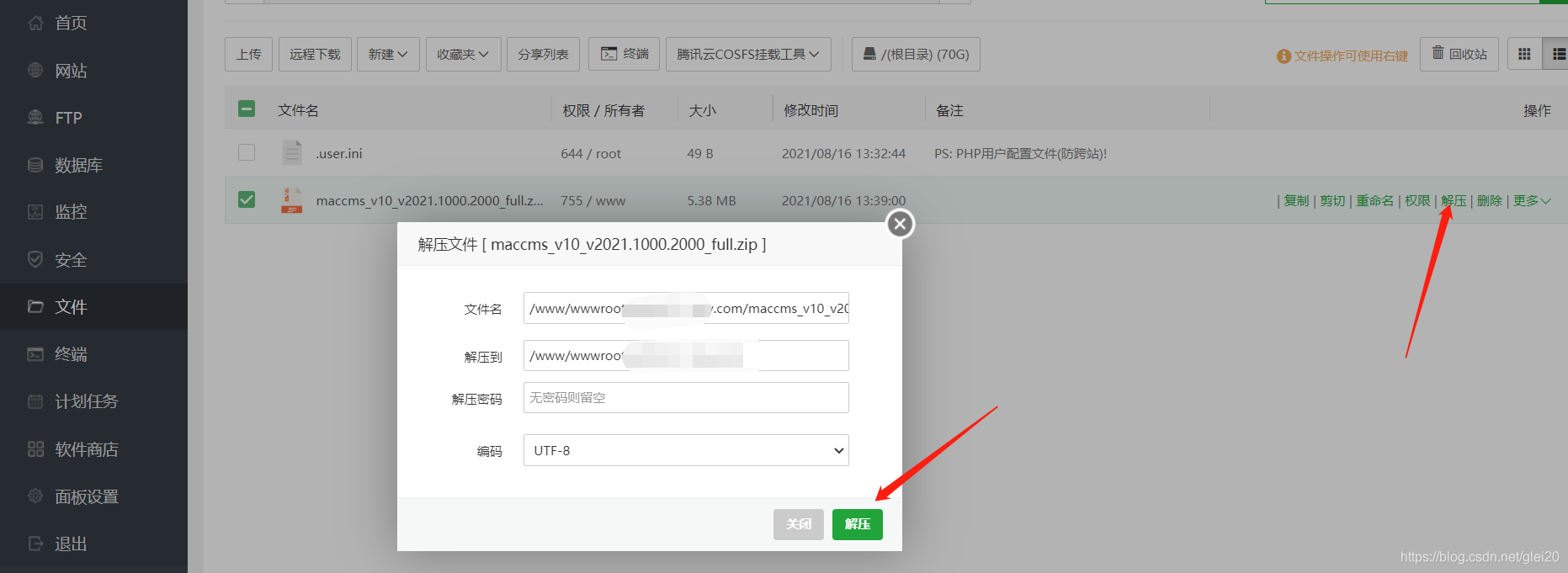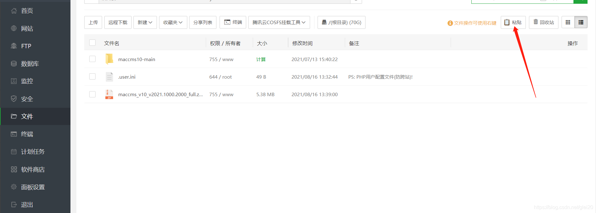 然后上传我们下载的苹果cms v10的压缩包到这里