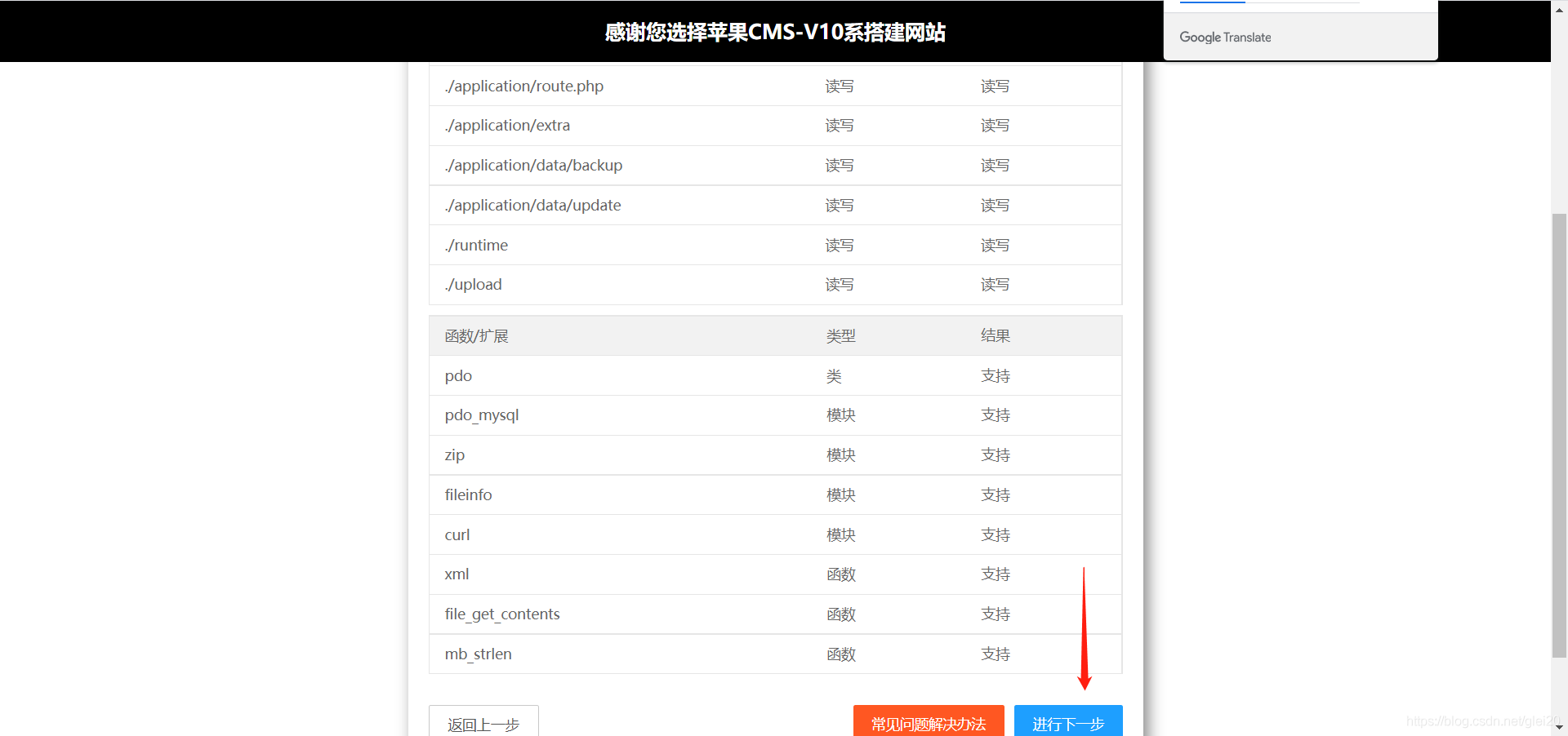 因为前期我们有些扩展已经安装了,所以这边运行环境检测基本上没问题,然后下一步