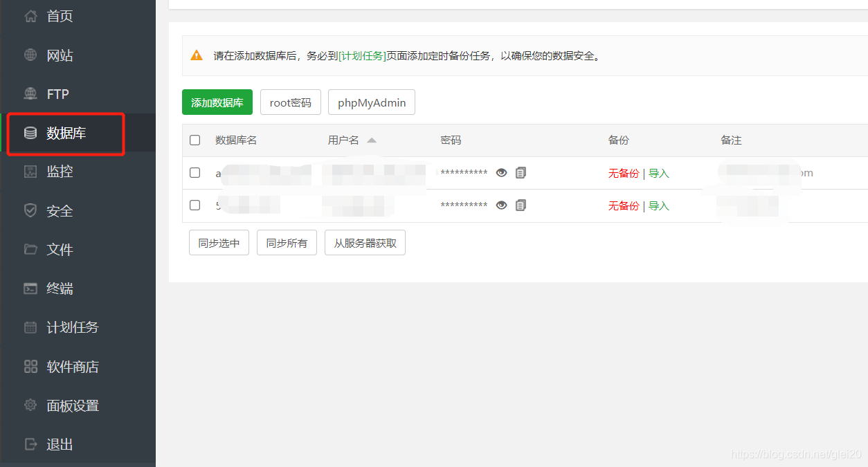 数据库账号密码忘记了可以在宝塔面板的【数据库】查看