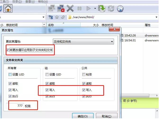 然后重要的一步来了,在ftp工具上找到你网站的根目录,一般为www或者html这样的目录,单击右键,选择属性,在弹出的界面上将所有权限打钩,并勾选将更改循环到子文件夹和文件!!!这个要切记,因为我一开始就没有这么做,后来就导致后台在修改一些信息的时候修改不了,提示什么“无法写入文件请重试”,一般后台操作都是没有问题的,只要它提示什么操作失败了,那你就要好好检查你操作的文件夹的权限问题了,是否可以写入。