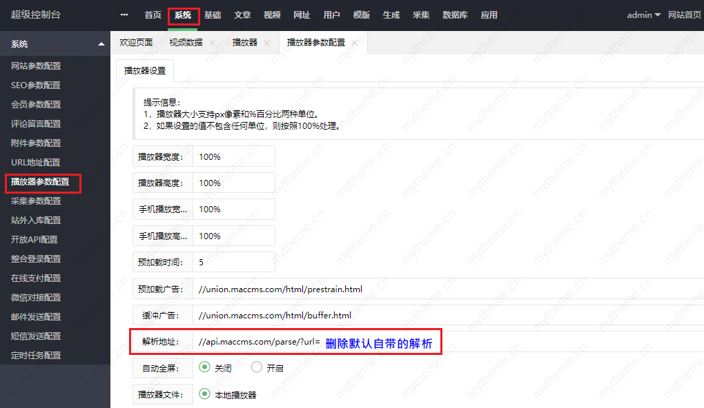 再者检查采集数据的播放地址,如果是完成的http地址,则需要开启播放器的解析状态用解析播放;如果采集的数据ID可以直接用本地播放器来进行播放。最后要删除系统默认自带的解析接口,默认解析接口已经失效。删除步骤如下图