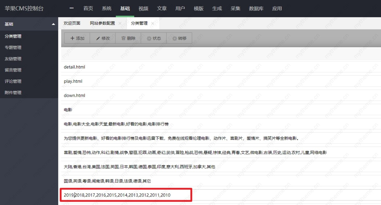 第二步:苹果CMS V10管理后台>>基础>>>分类管理>>>将【1:电影。2:电视剧。3:综艺。4:动漫】>>> 扩展年代>>> “2019,”逗号隔开(就是在2018,前面加上【2019,2020】保存即可。)
