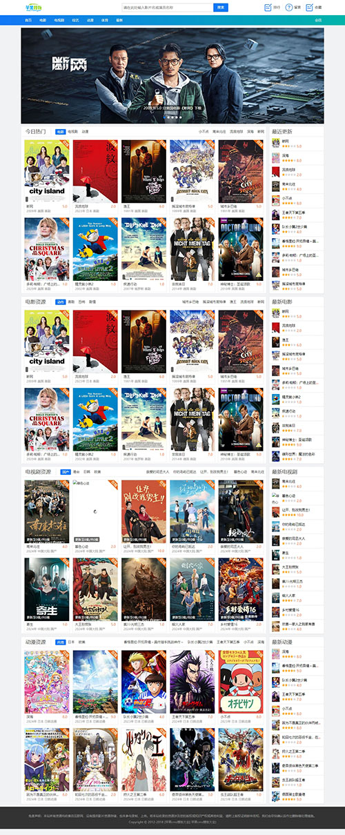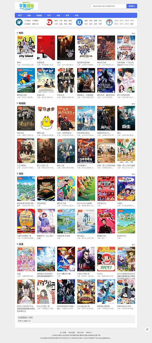 首页为经典蓝色简约设计,带pc、wap两套模板文件夹,适合于影视网站。已针对原模板更新如下: 详情页新增下载功能; 修复原详情页图片bug; 修复了原模板首页空